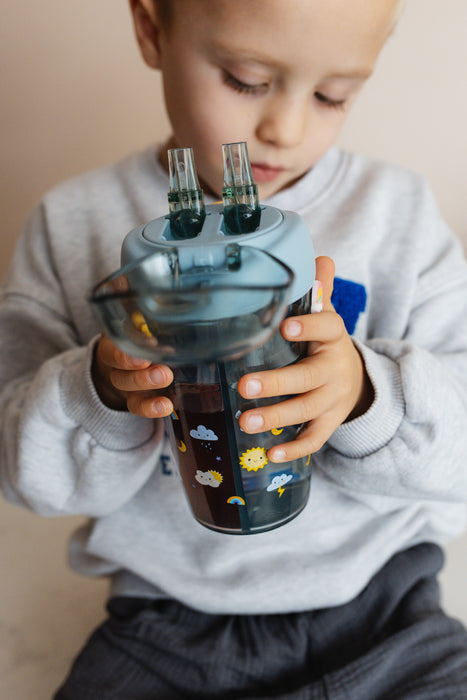 Sparkling transparent drinking bottle with 2 compartments, 2 drinks in 1 bottle!