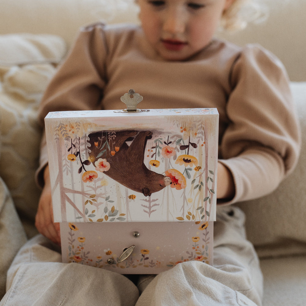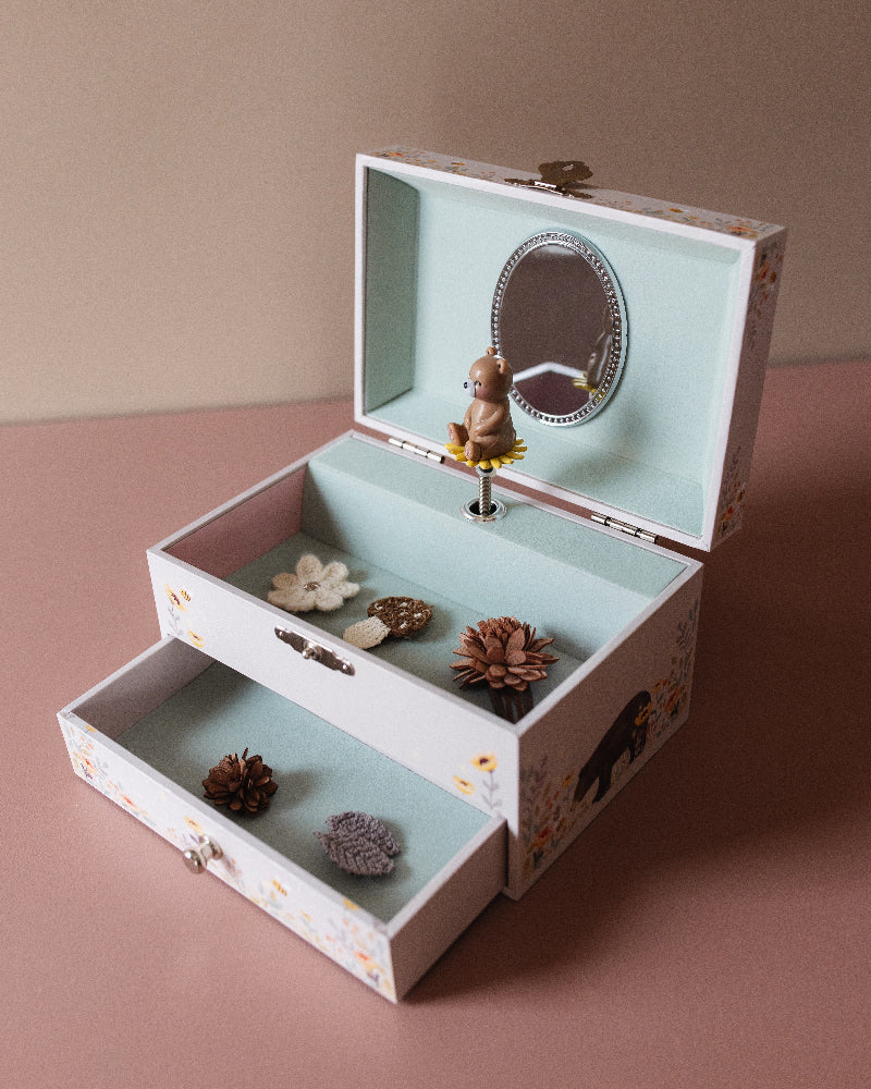 The music box has a small drawer to store all your rings, necklaces and hair clips.