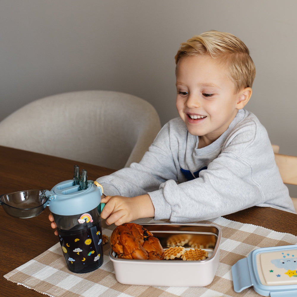 Sparkling sky drinking bottle, a transparent blue bottle with 2 compartments, 2 drinks in 1 bottle! All over sky print + 3D silicone stickers rainbow, fish, cloud and a pinguïn which can be placed on bottle or the lid.